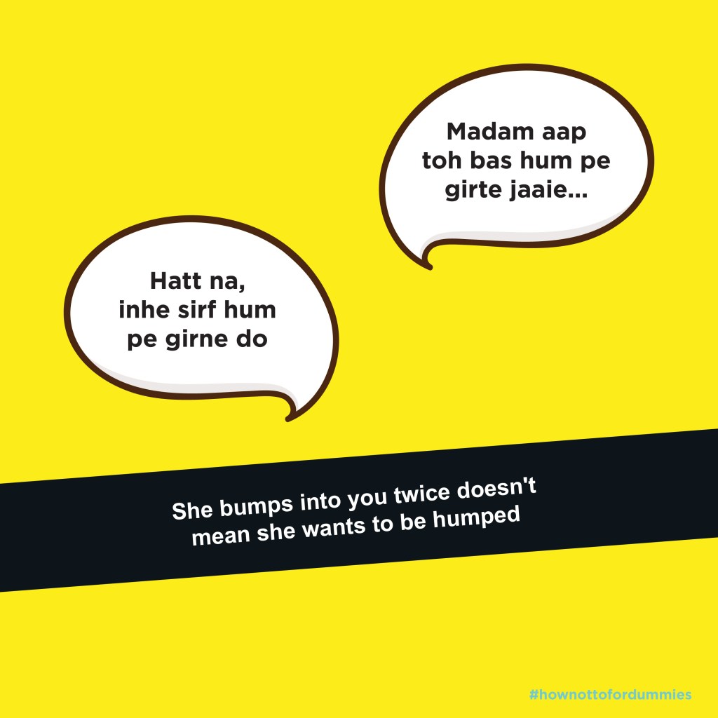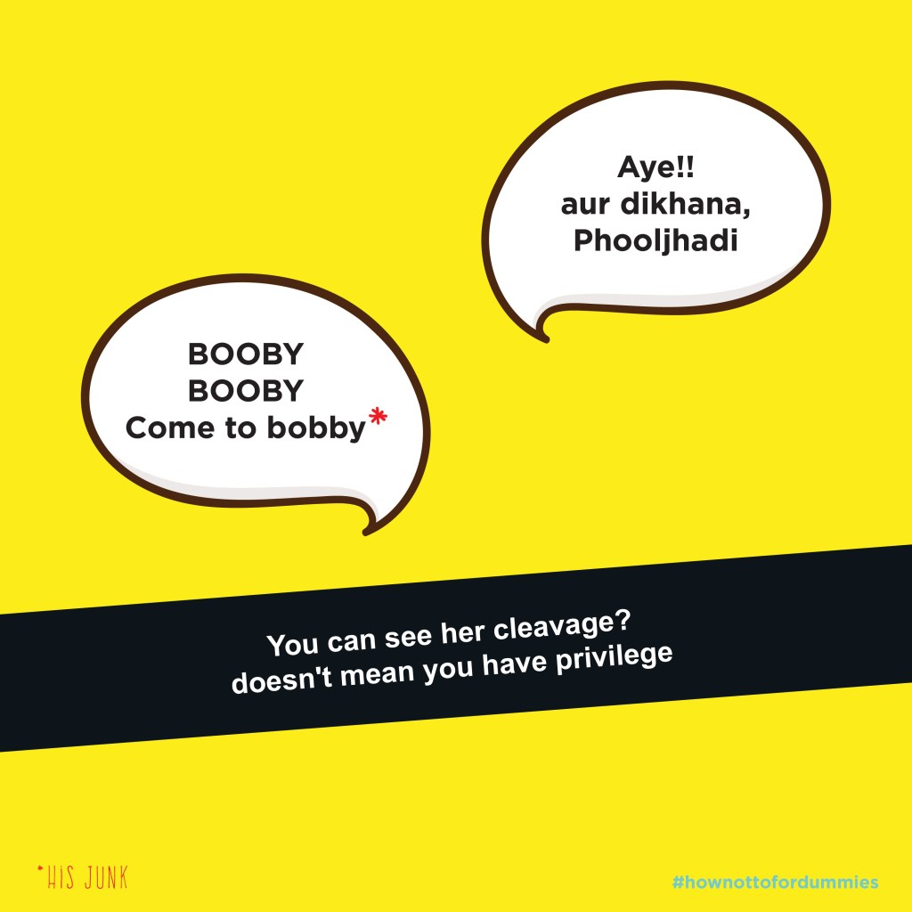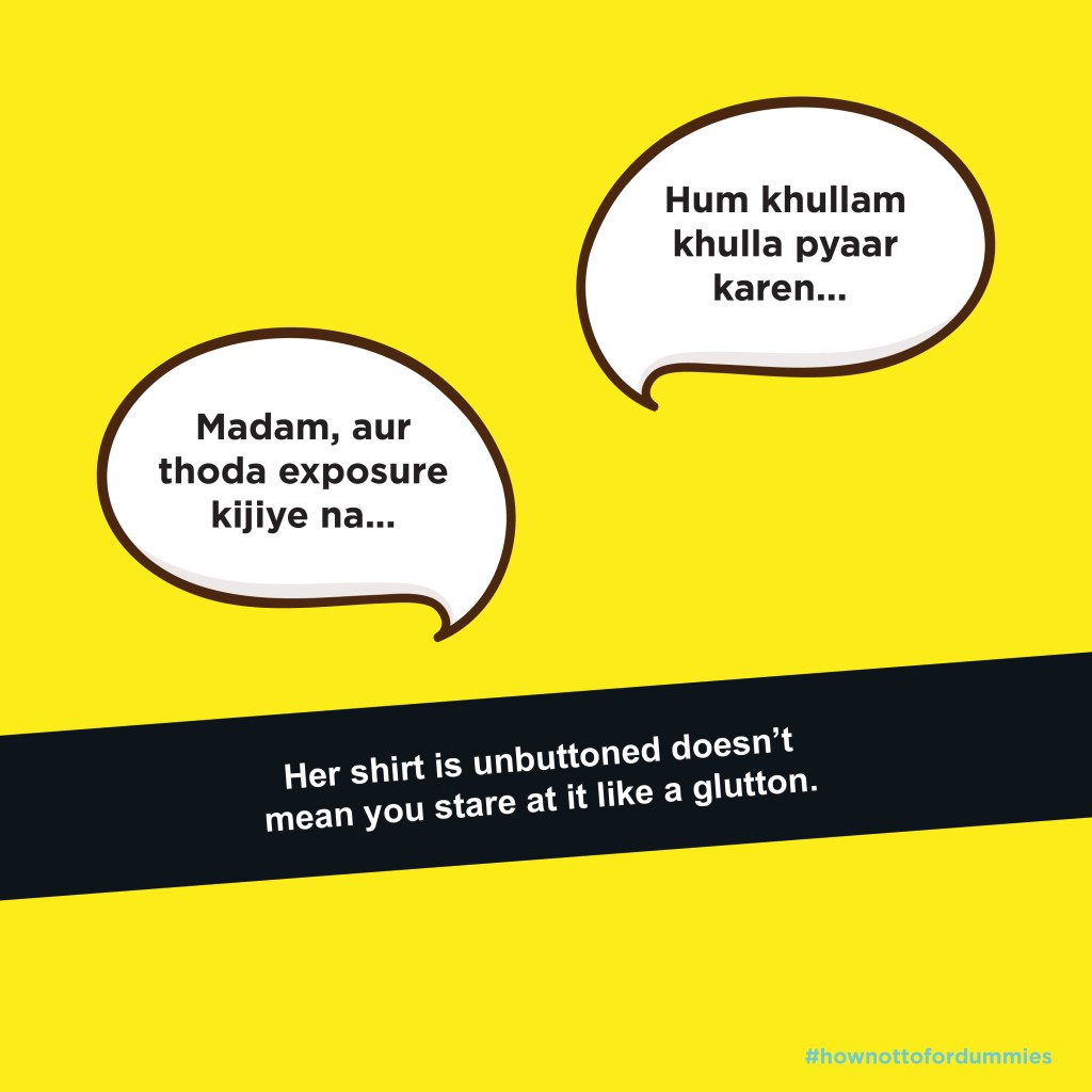 This topic is very close to my heart. If you have known me personally, then you would know how much I would have loved working on this. Anyways, here presenting to you is our version of how to for dummies. This series is a sort of reminder for men and women out there that it is indeed time to #sochbadlo. We have jotted down our personal experience as well as experiences of many other women who have had to face harassment in their day to day lives. Some of these points may seem obvious to some or someone you may go like ‘duh, yeh toh pata hai’ but it’s OK, won’t hurt you to go through them against and maybe share it with your friends. The idea behind this series was something I remember from my childhood. We were always asked to read something over and over again and by heart it even, so we understood the lesson well. The same sentiments are attached to this project too. We see an uproar of support and correction of behavior when a case of harassment catches the limelight. But these emotions and actions fizzle out once the story looses attention. This series is a reminder in those instances. We publish one every Wednesday and hope that this top doesn’t just fizzle out. **Some of the language used might sound cheap and vulgar. But do keep in mind that some of us have actually heard it being said to us
